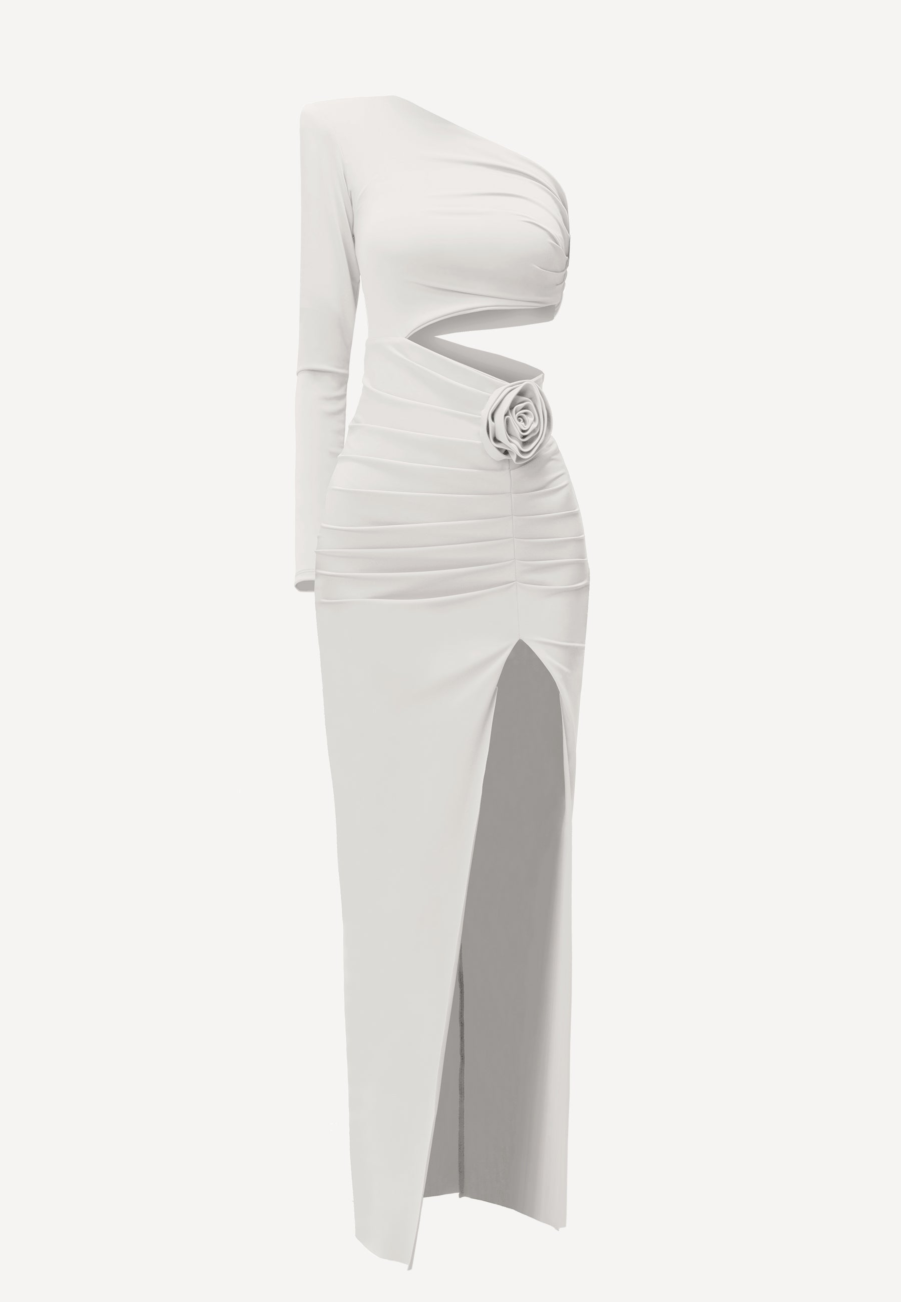 The dress is crafted from stretchy fabric with gathering at the hips and waist, accompanied by raised shoulders. The asymmetrical cut beautifully accentuates the figure, while a generous slit adorned with a rose adds a touch of lightness to the dress.