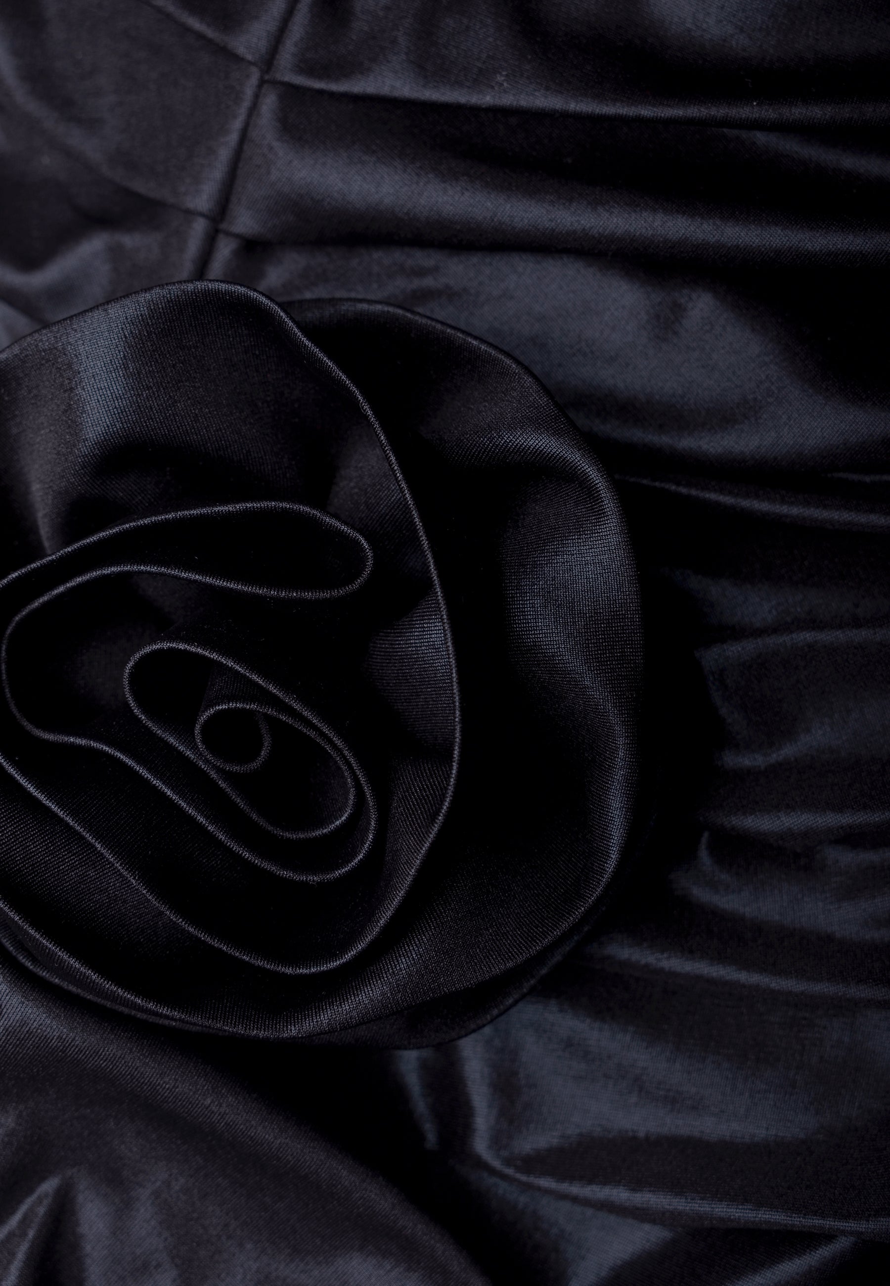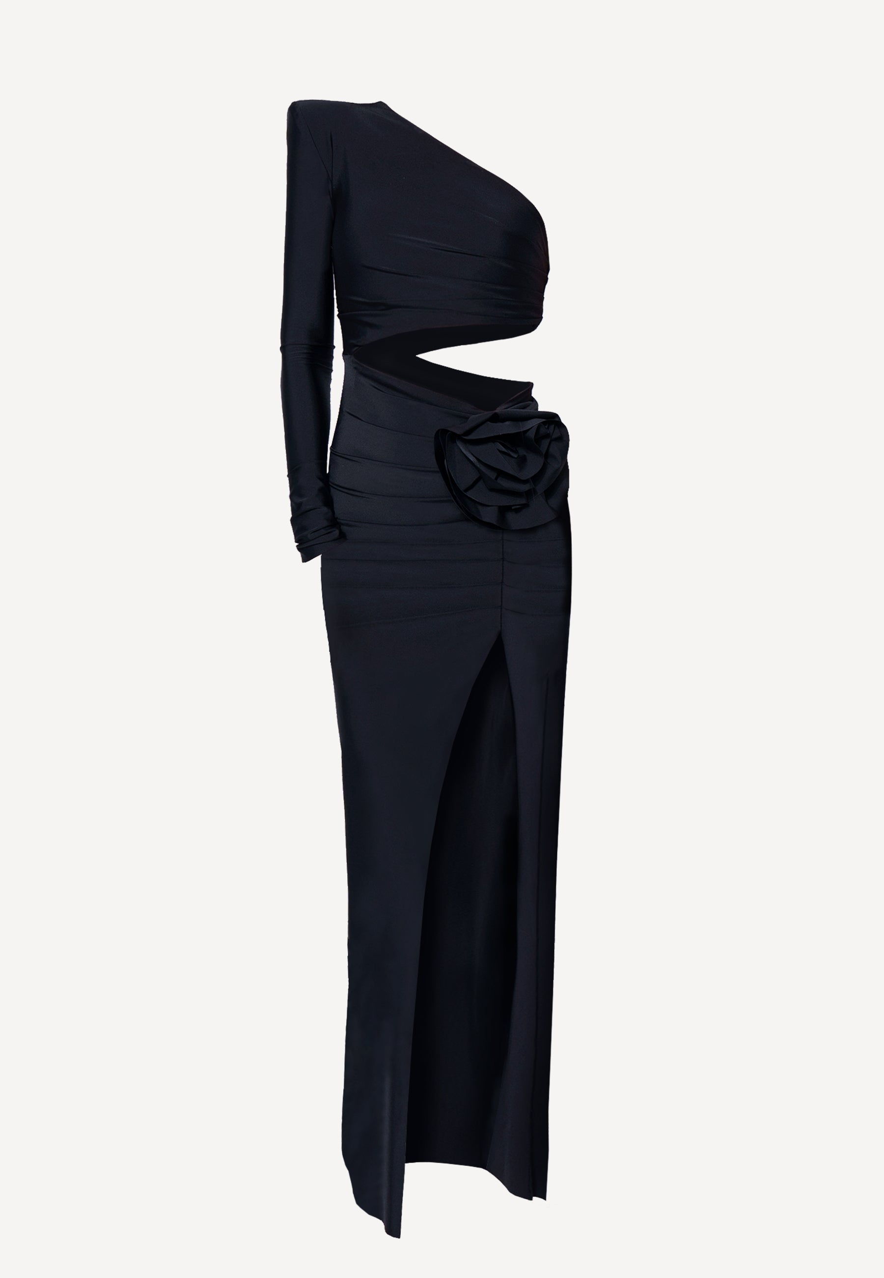 The dress is crafted from stretchy fabric with gathering at the hips and waist, accompanied by raised shoulders. The asymmetrical cut beautifully accentuates the figure, while a generous slit adorned with a rose adds a touch of lightness to the dress.