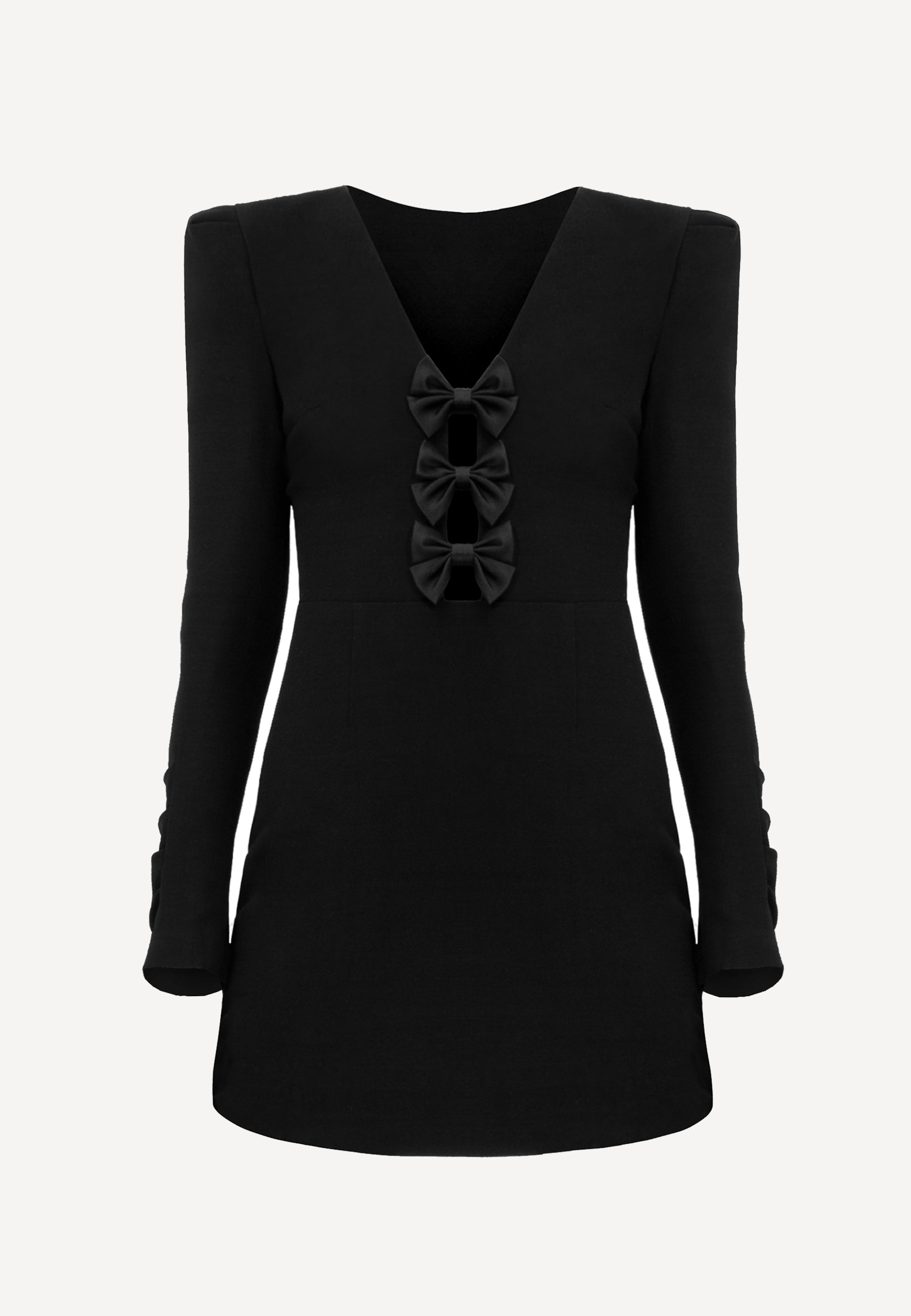 The Angelina dress is crafted from a mid-weight jacquard fabric. The V-neckline extends all the way to the waist, with its slit adorned by silk satin, hand-tied bows for a delicate touch. The dress flares out from the waist down, and the sleeve hems feature decorative pleats, adding an extra layer of elegance. The sleeves showcase a distinctive geometric puff shape, reinforced with a small cushion for added structure.