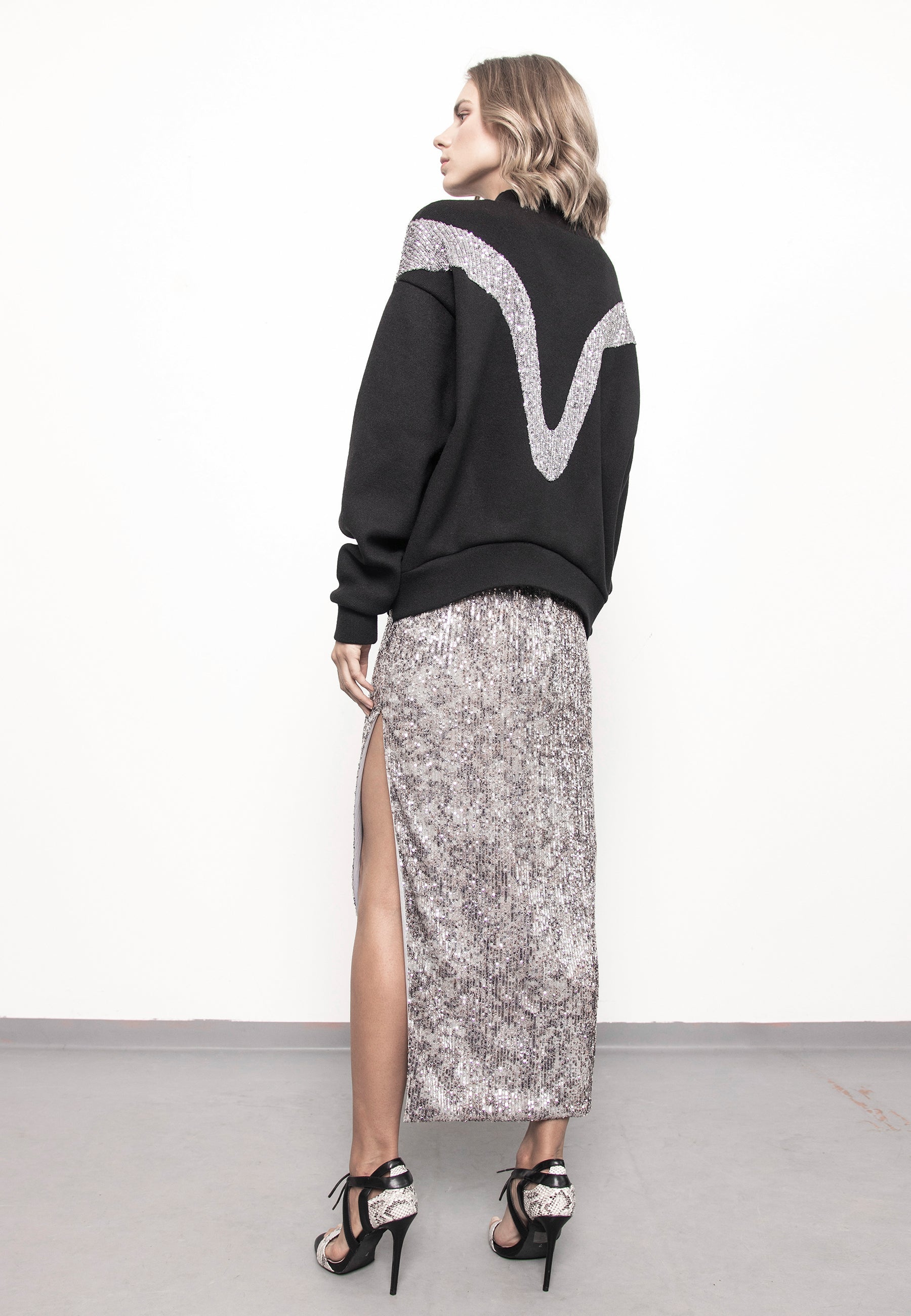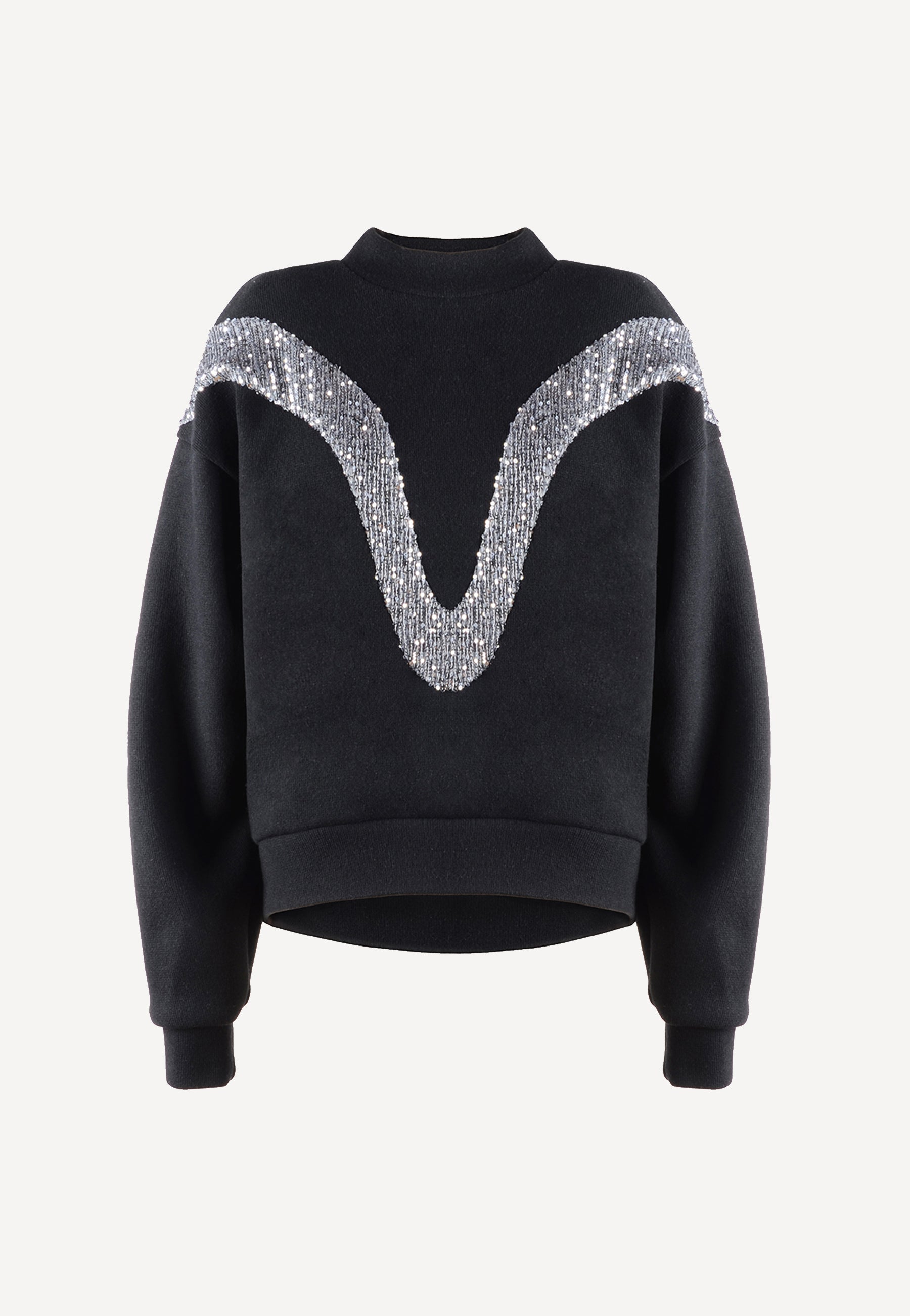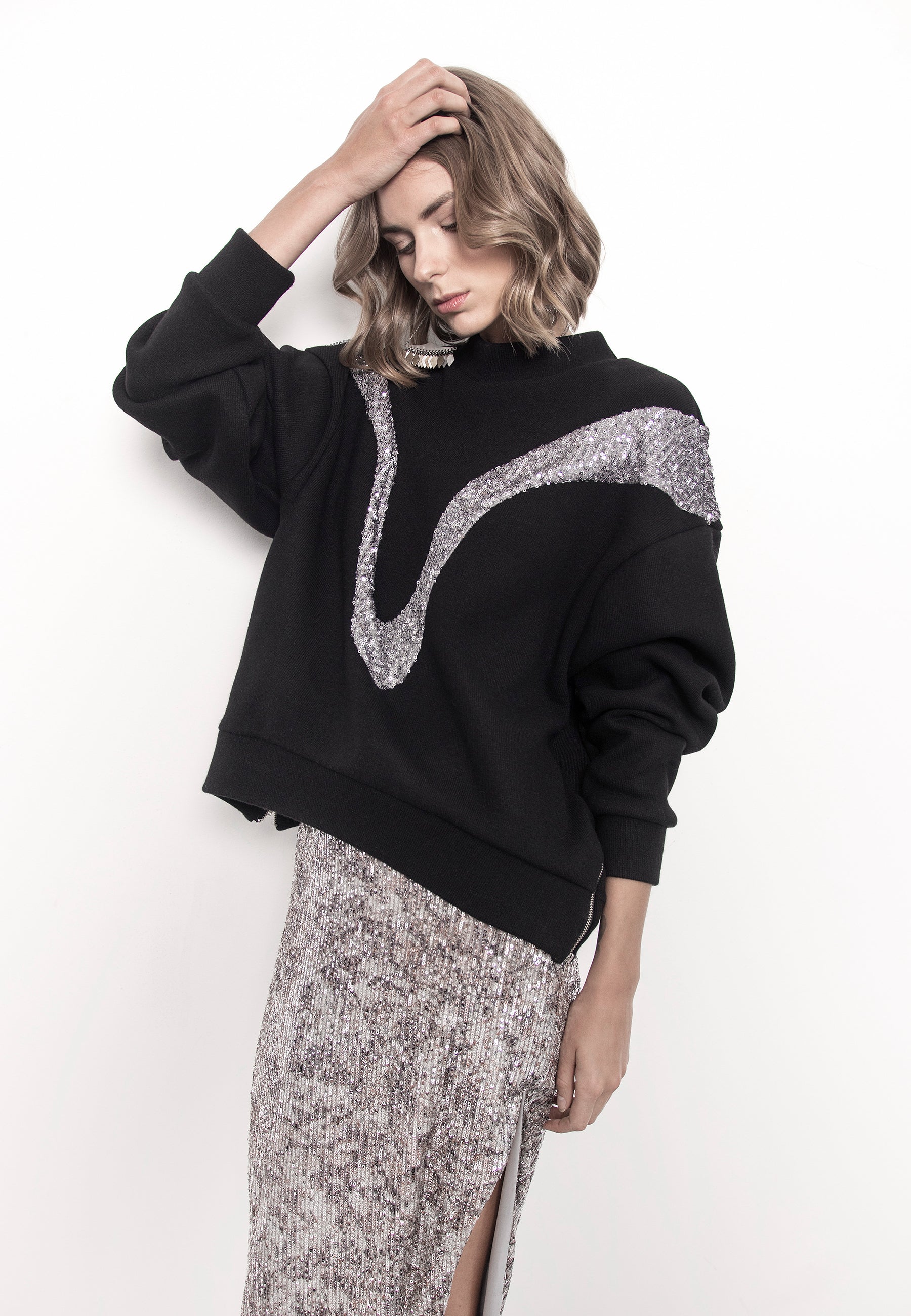A blouse adorned with a wave-shaped appliqué made of sequin-embroidered fabric. Featuring wide sleeves reminiscent of the 80s style, this blouse is crafted from a cotton fabric that is not only pleasant to the touch but also substantial.