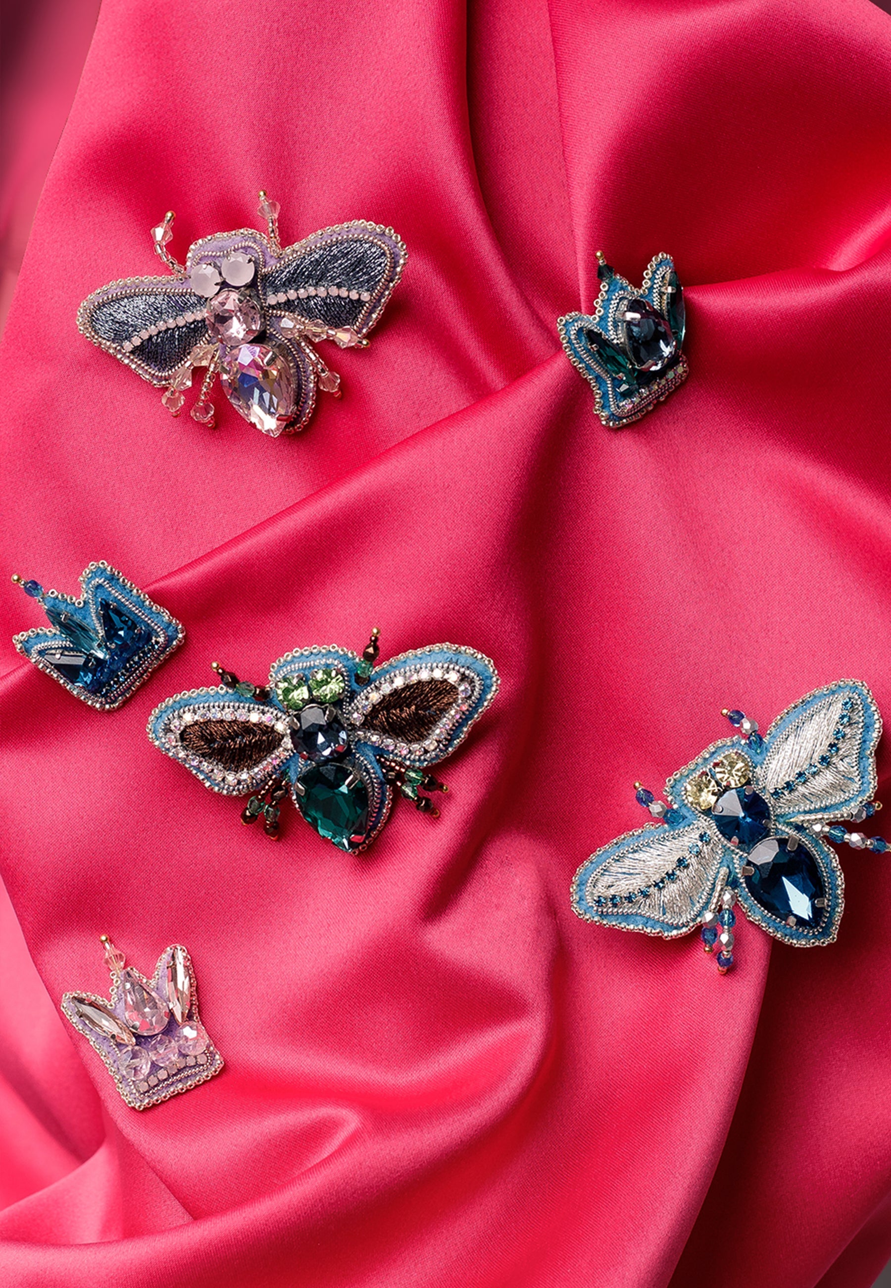 A handcrafted butterfly-shaped brooch in a pink hue, meticulously adorned with intricate glass and crystal beads. This exquisite accessory adds a touch of artistry and sophistication to your ensemble. Perfect for pinning to your lapel, scarf, or blouse, this unique piece showcases the beauty of craftsmanship and the sparkle of glass and crystals.