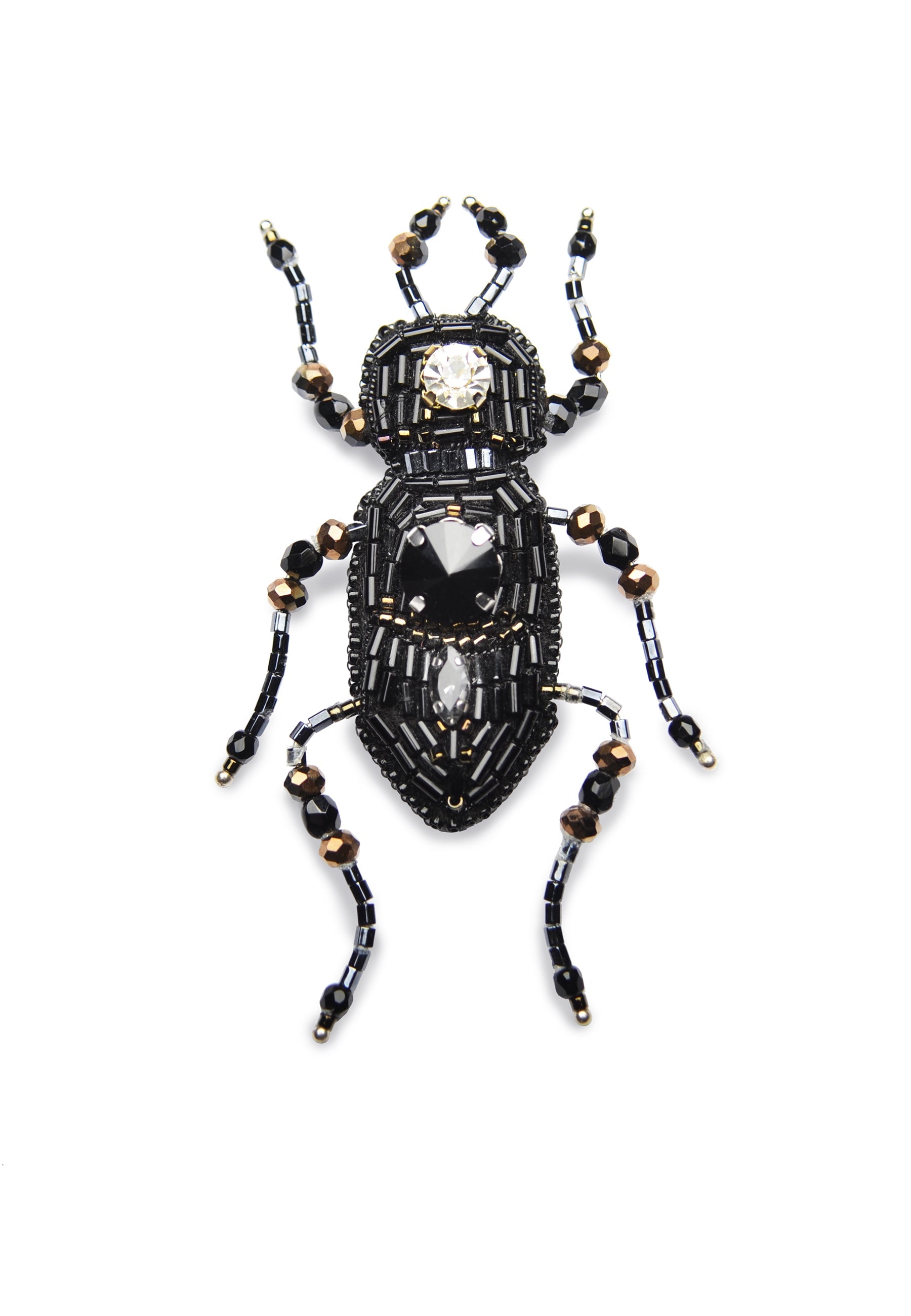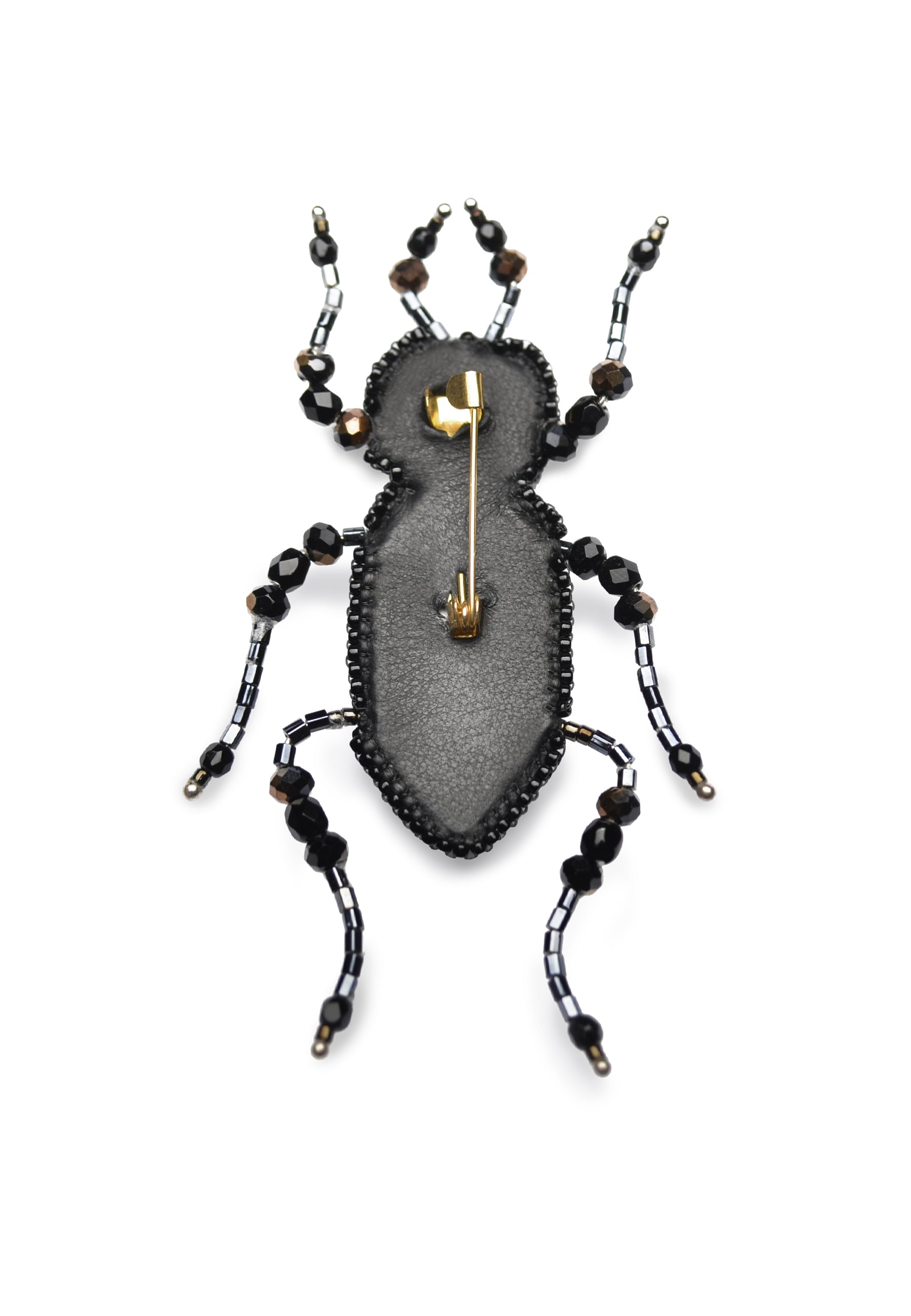 A handcrafted beetle-shaped brooch in a black hue, meticulously adorned with intricate glass and crystal beads. This exquisite accessory adds a touch of artistry and sophistication to your ensemble. Perfect for pinning to your lapel, scarf, or blouse, this unique piece showcases the beauty of craftsmanship and the sparkle of glass and crystals.