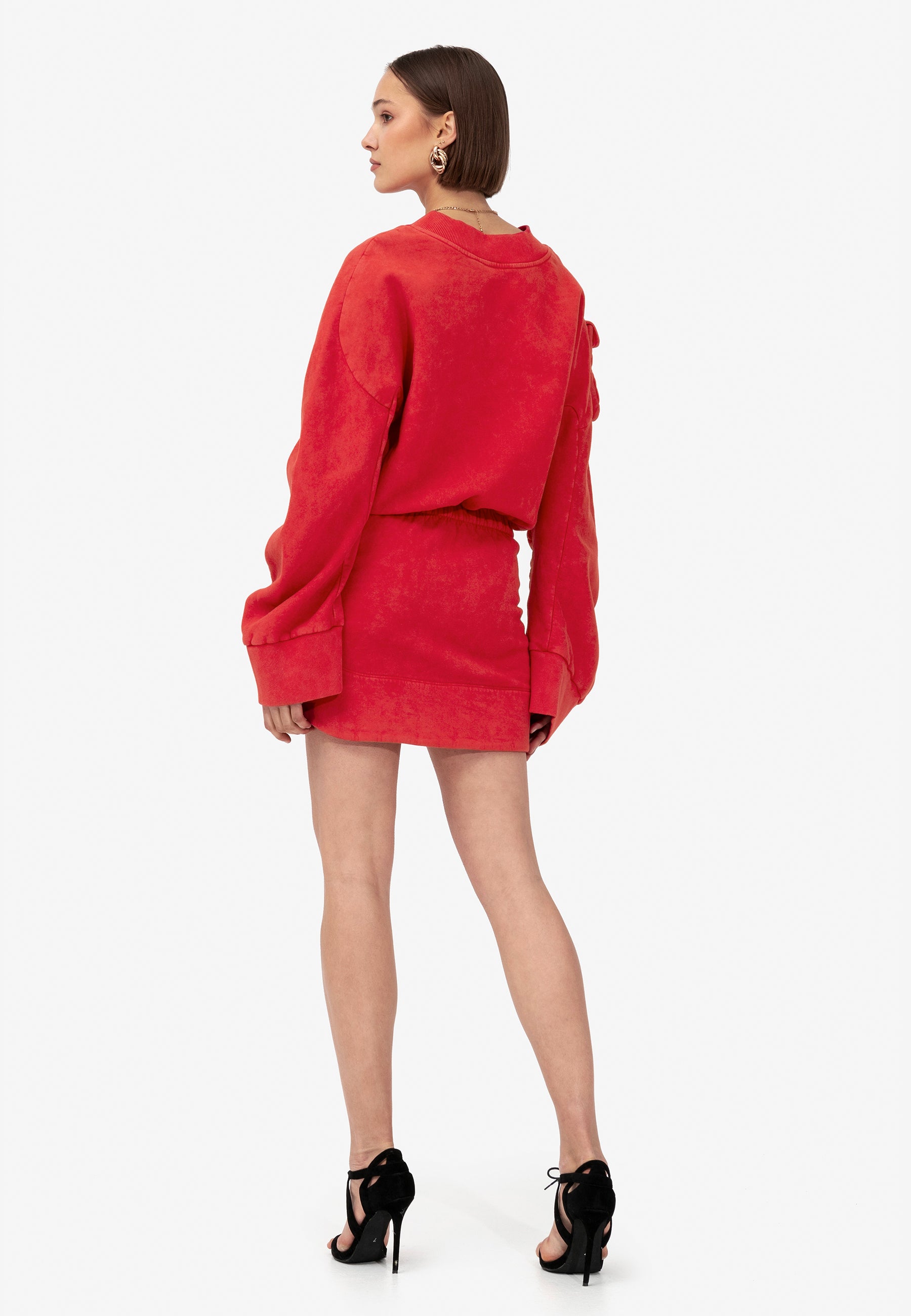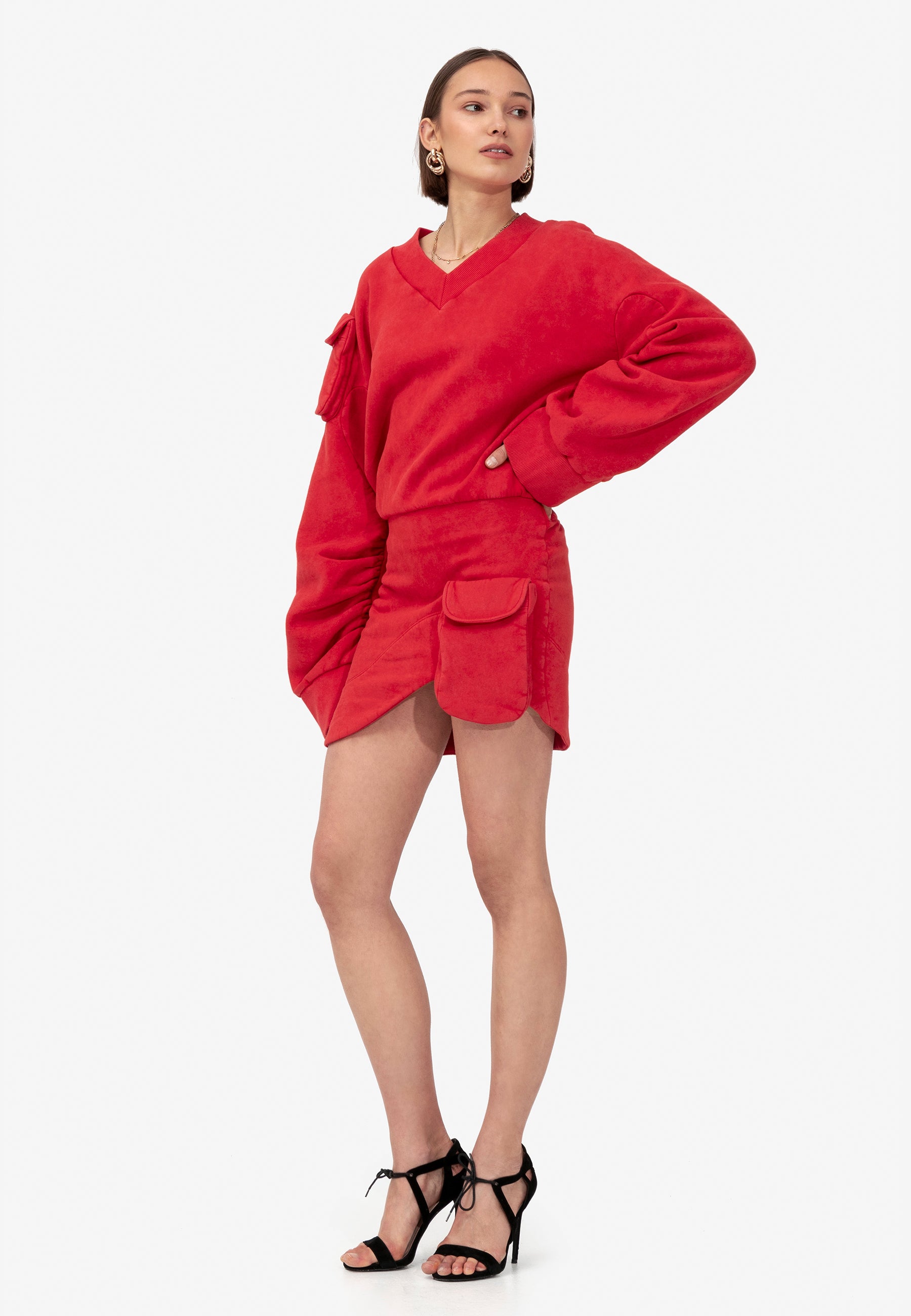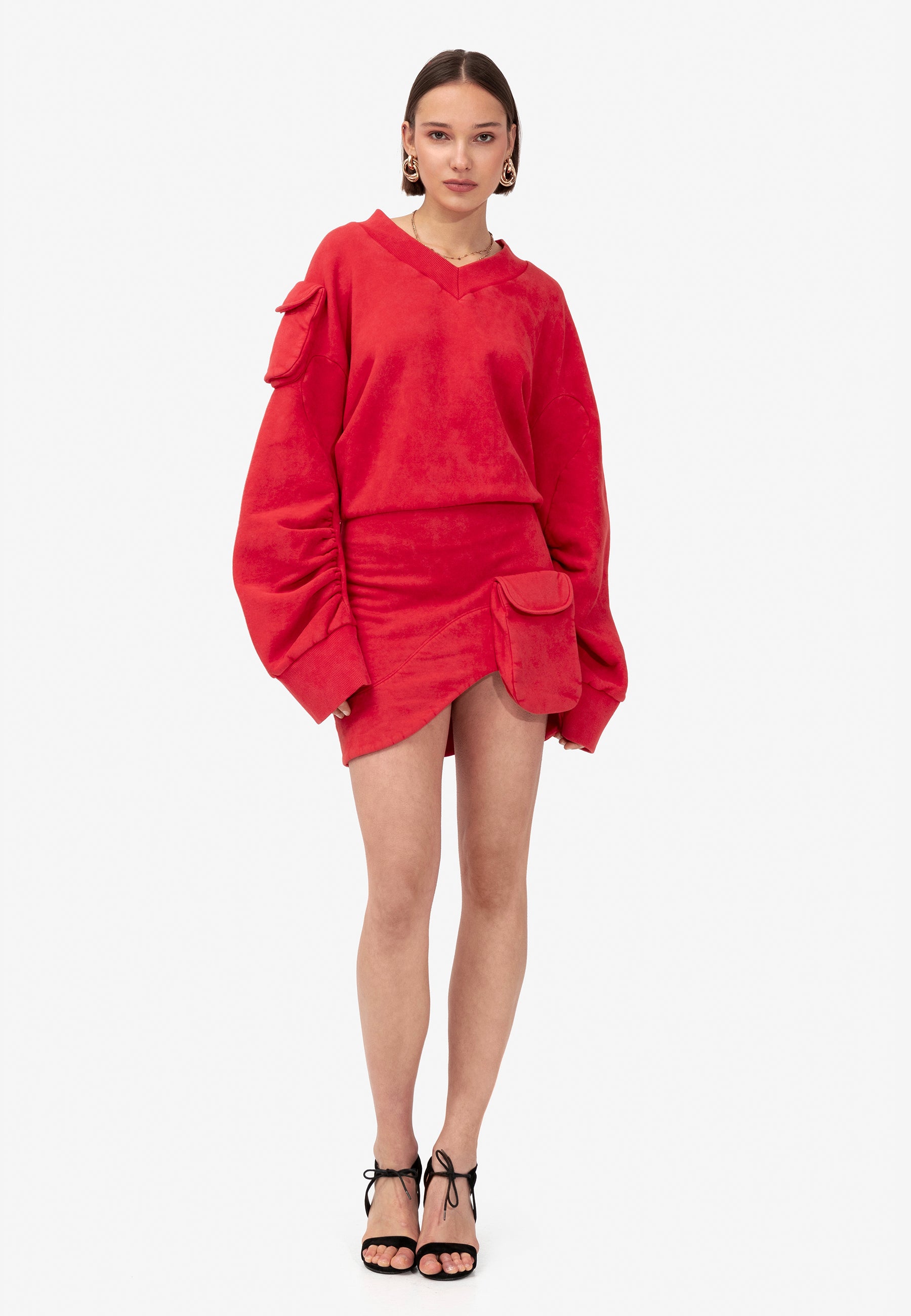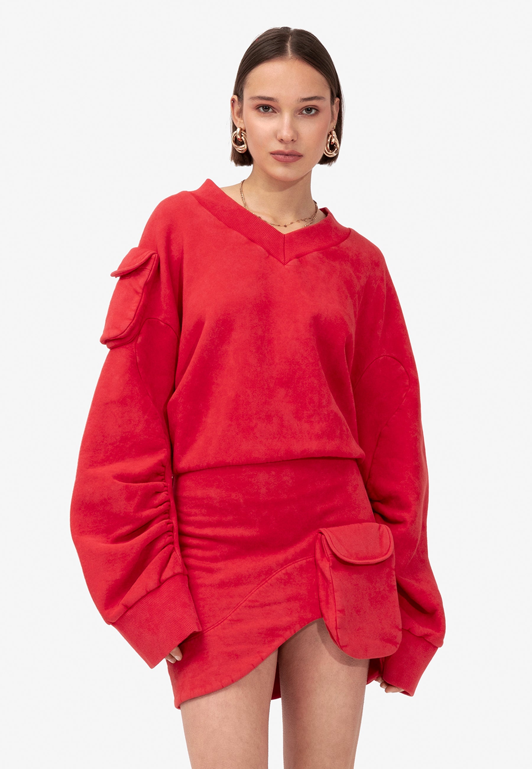 Introducing the Knot knit dress, crafted from sumptuous red jersey fabric. Boasting an oversized top and a gracefully fitted bottom, it offers a harmonious blend of comfort and style. Featuring cargo pockets adorning the shoulder of the top and the front of the skirt, this versatile piece effortlessly combines functionality with flair. Whether paired with boots or sandals, it promises to elevate any ensemble with effortless sophistication.