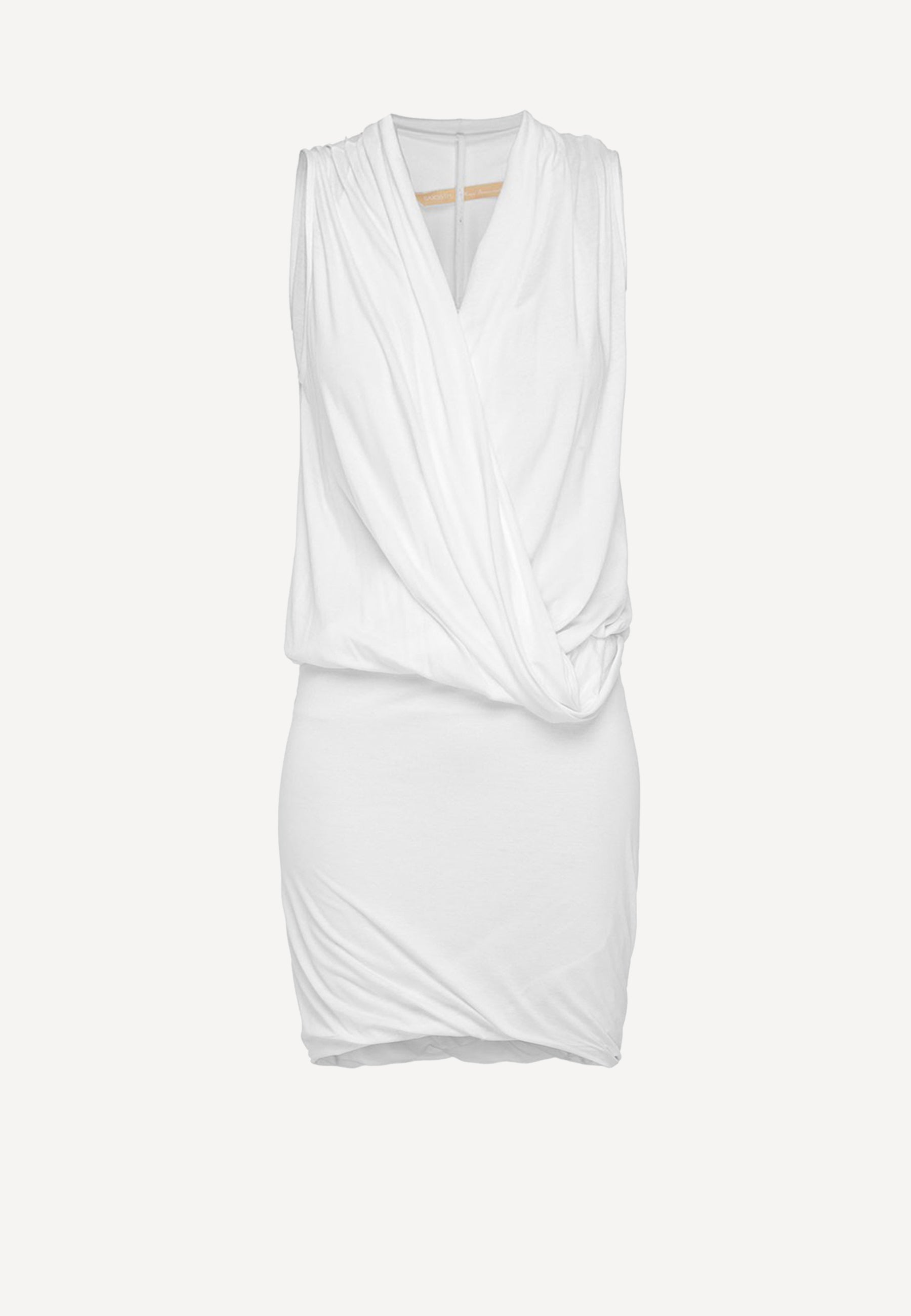 The Teina dress is crafted from a flowing and lightweight fabric in an ecru hue. From the neckline to the waist, it features a ruched shawl collar that drapes gracefully down the skirt line. The bottom is gathered at the hips, and the top has an internal slip with adjustable straps, fastened with snaps. Sleeveless and designed in a tank style.