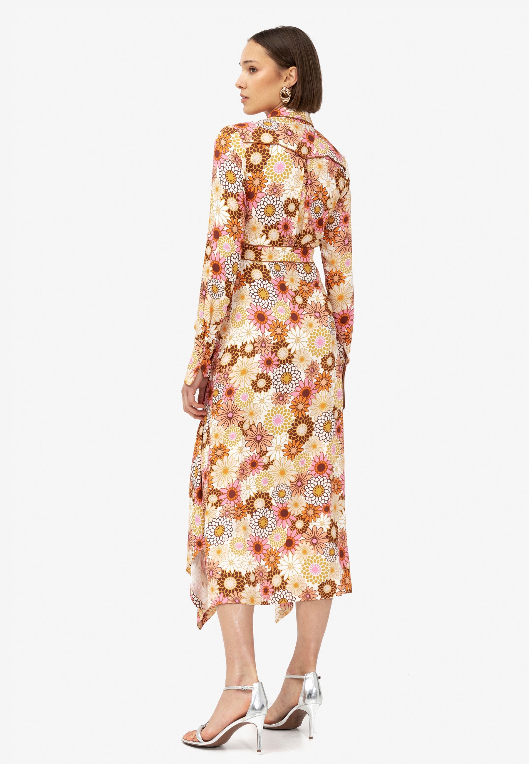 A dress made of lightweight viscose fabric with a floral pattern in shades of cream and orange. The dress is finished with a yoke and a pleat closure adorned with decorative, handcrafted trim in the shape of an ornament. The front of the skirt is cut with a yoke and finished with a patterned material. The back of the dress is classic with a pleat along the spine. The waistband is not elastic. Beautiful spring floral patterns reminiscent of the 'Flower Power' movement.