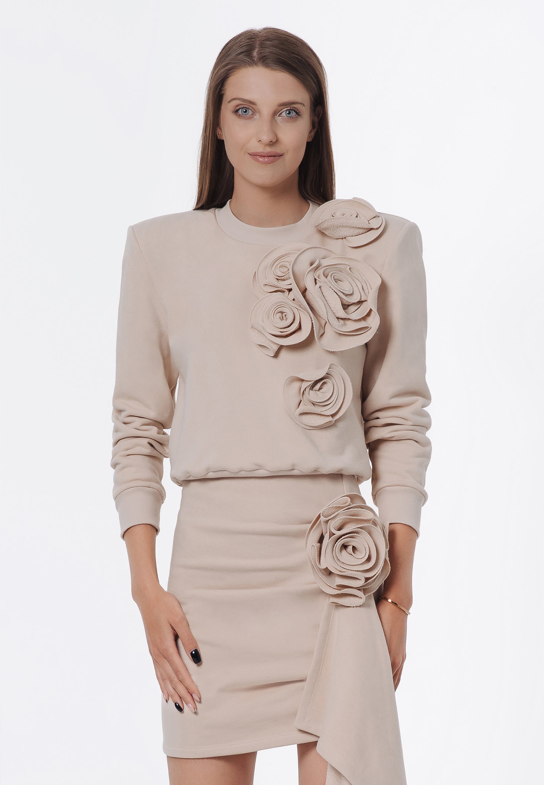 The Jackson sweatshirt is crafted from plush cotton in a cookie dough hue. Reinforced shoulders with shoulder pads. Features a front appliqué of five hand-rolled flowers. Complete the look with our mini skirt adorned with floral appliqués.