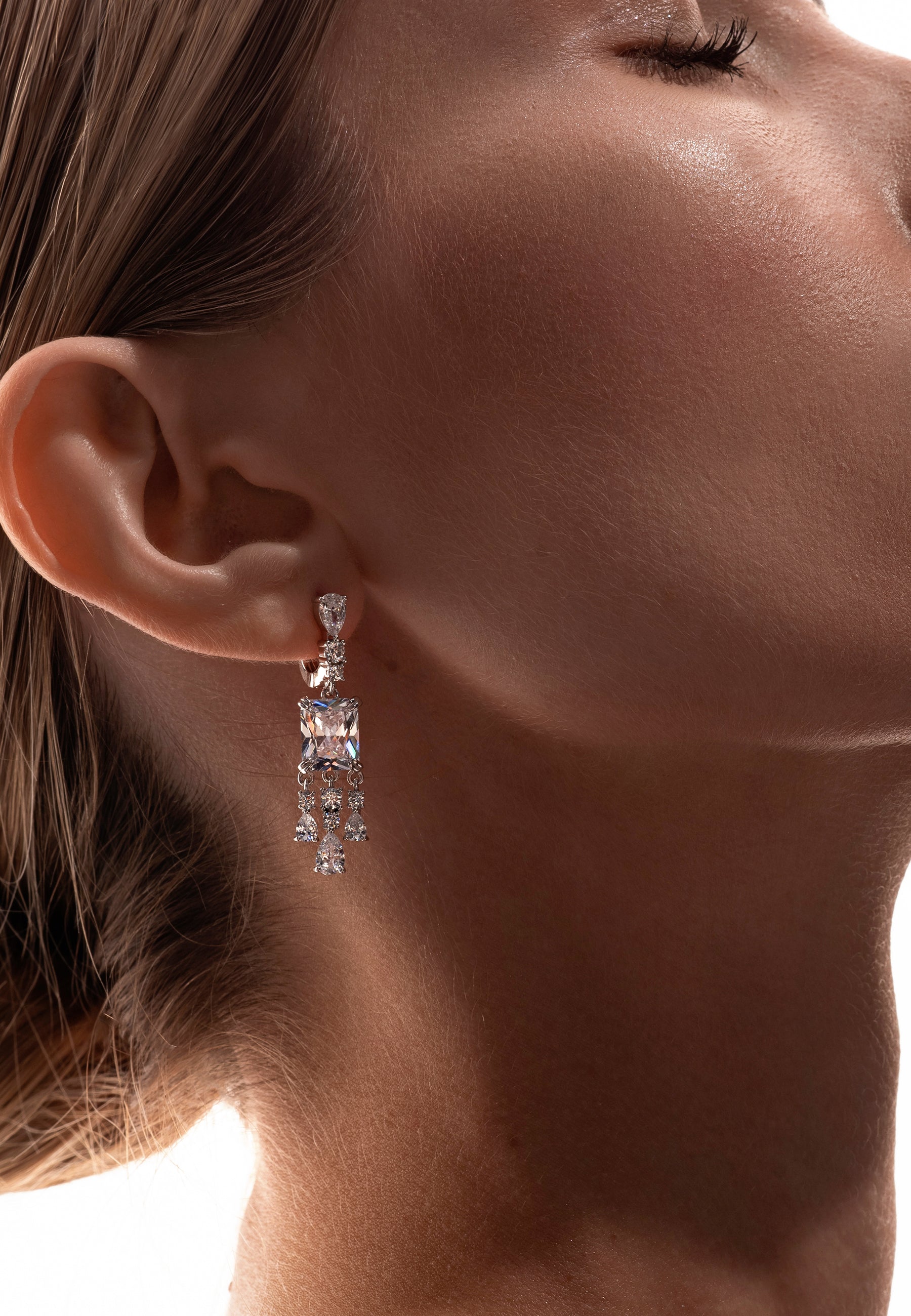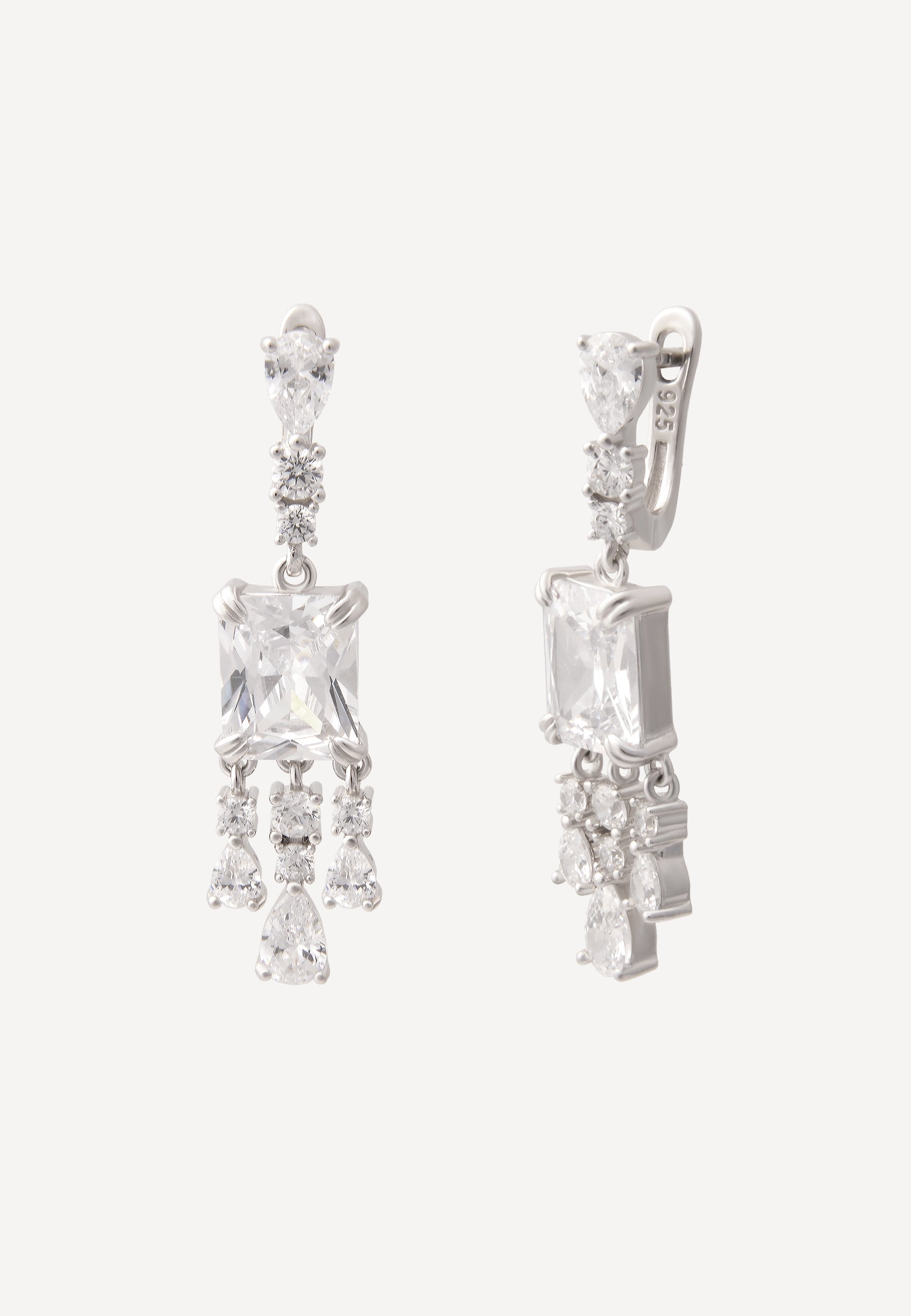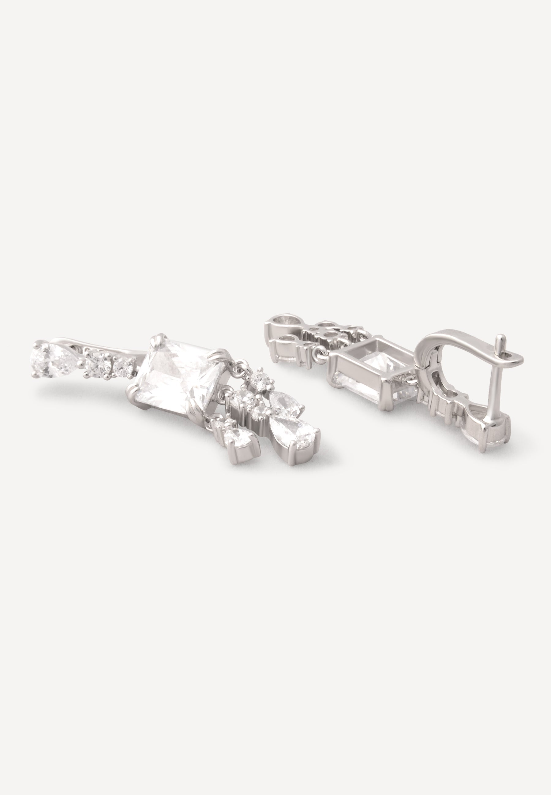 Crafted from rhodium-plated silver, these exquisite drop earrings offer timeless sophistication. The Russian fastening provides a secure fit, while the brilliant zircon crystals, arranged in both clustered and dangling forms, create an eye-catching sparkle. Ideal for special occasions, these earrings add a refined elegance to any outfit.