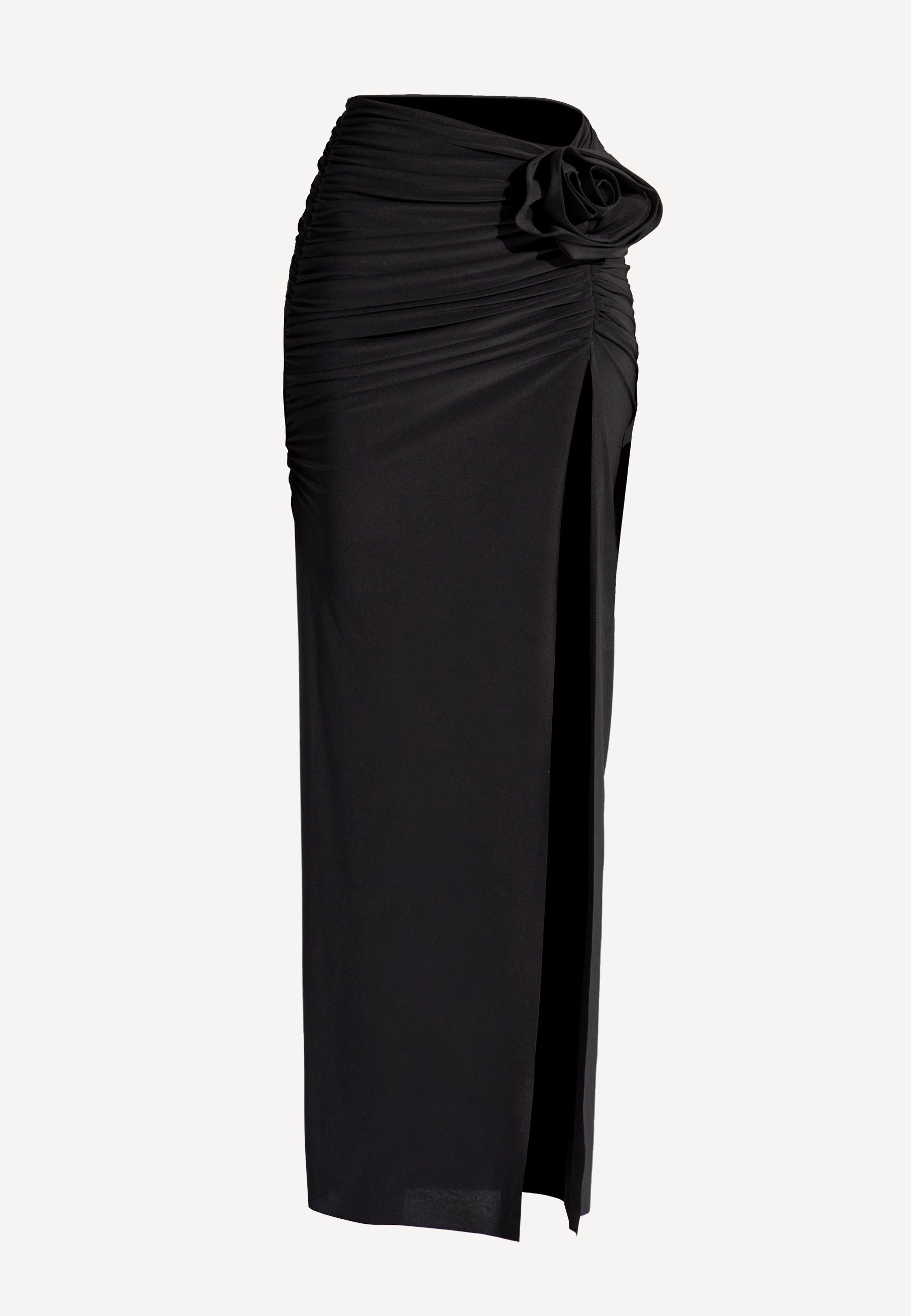 The Rosa skirt is made from stretchy fabric with gathers at the hips and waist. Its asymmetrical cut highlights the figure, and a generous slit embellished with a rose adds a touch of elegance to the piece.
