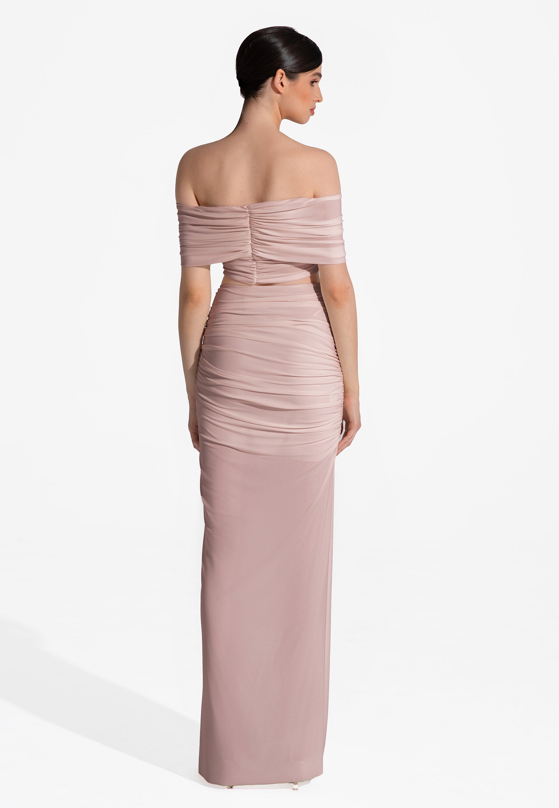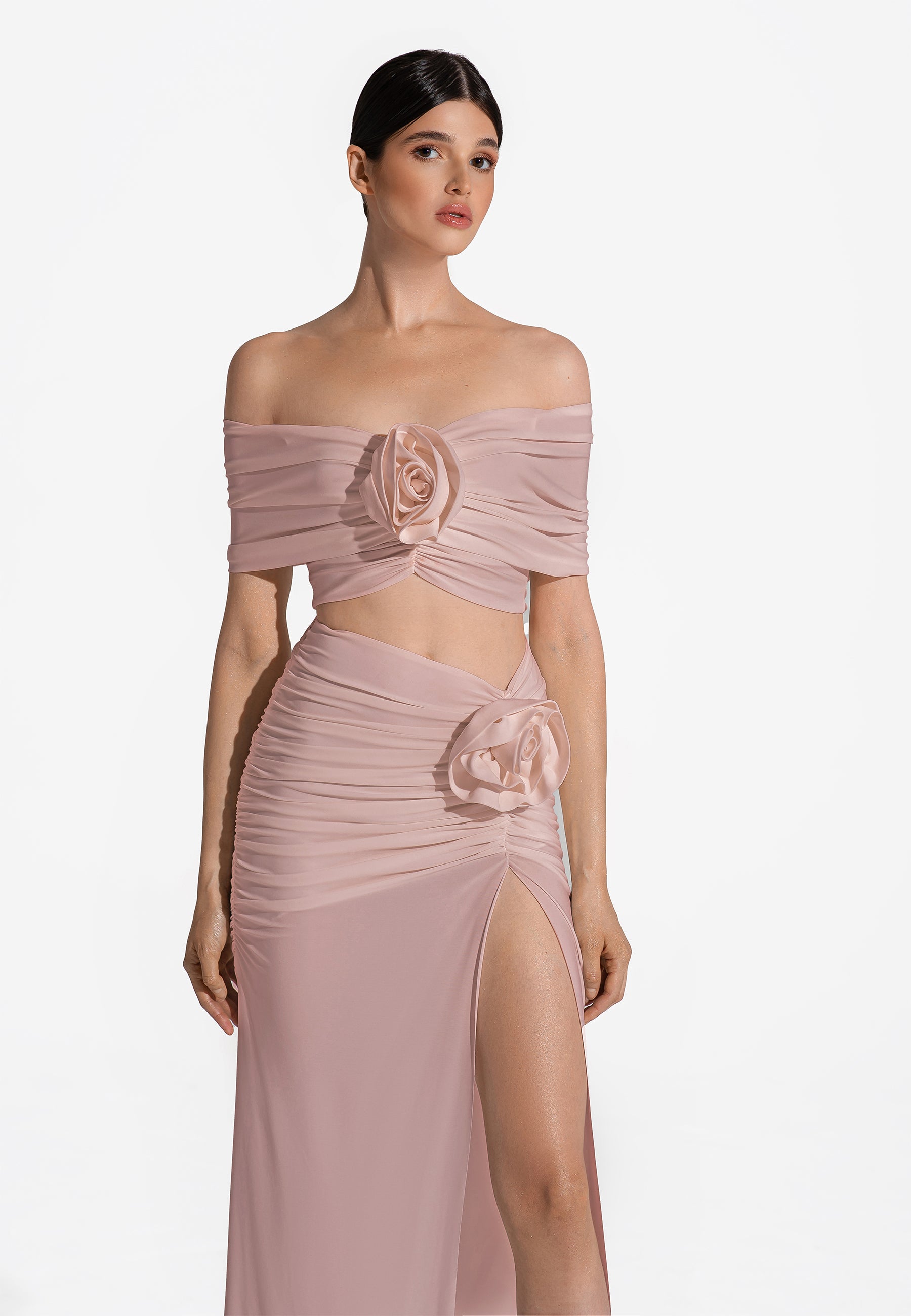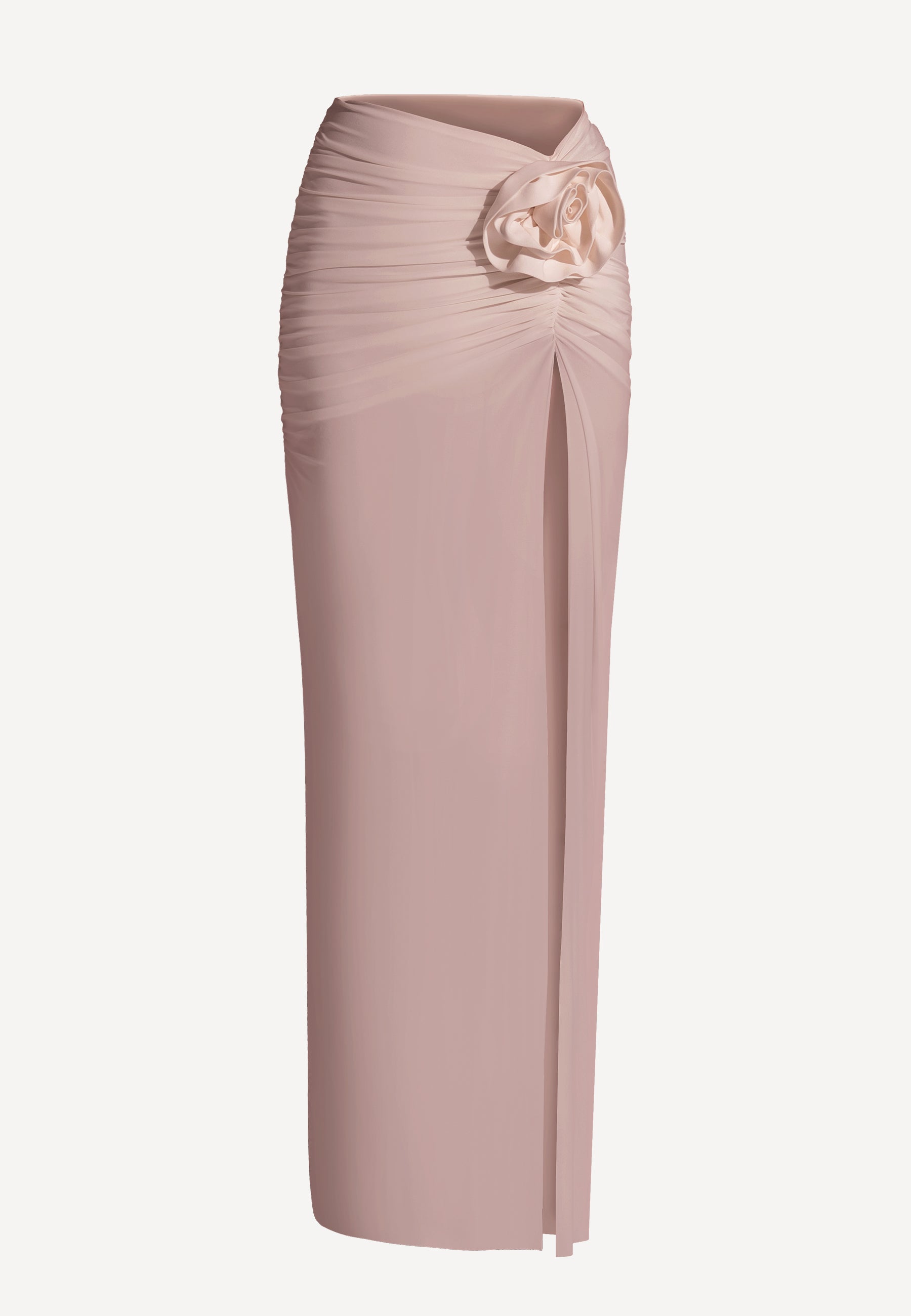 The Rosa Nude skirt is made from stretchy fabric with gathers at the hips and waist. Its asymmetrical cut highlights the figure, and a generous slit embellished with a rose adds a touch of elegance to the piece.