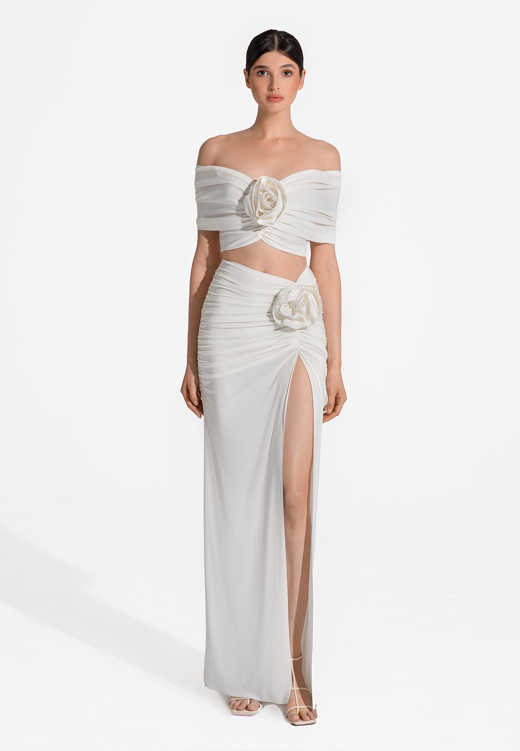 The Rosa Ecru top is crafted from stretchy fabric, featuring gathers at the bust and waist. Its symmetrical cut flatters the figure, while an embellished rose adds an elegant touch.