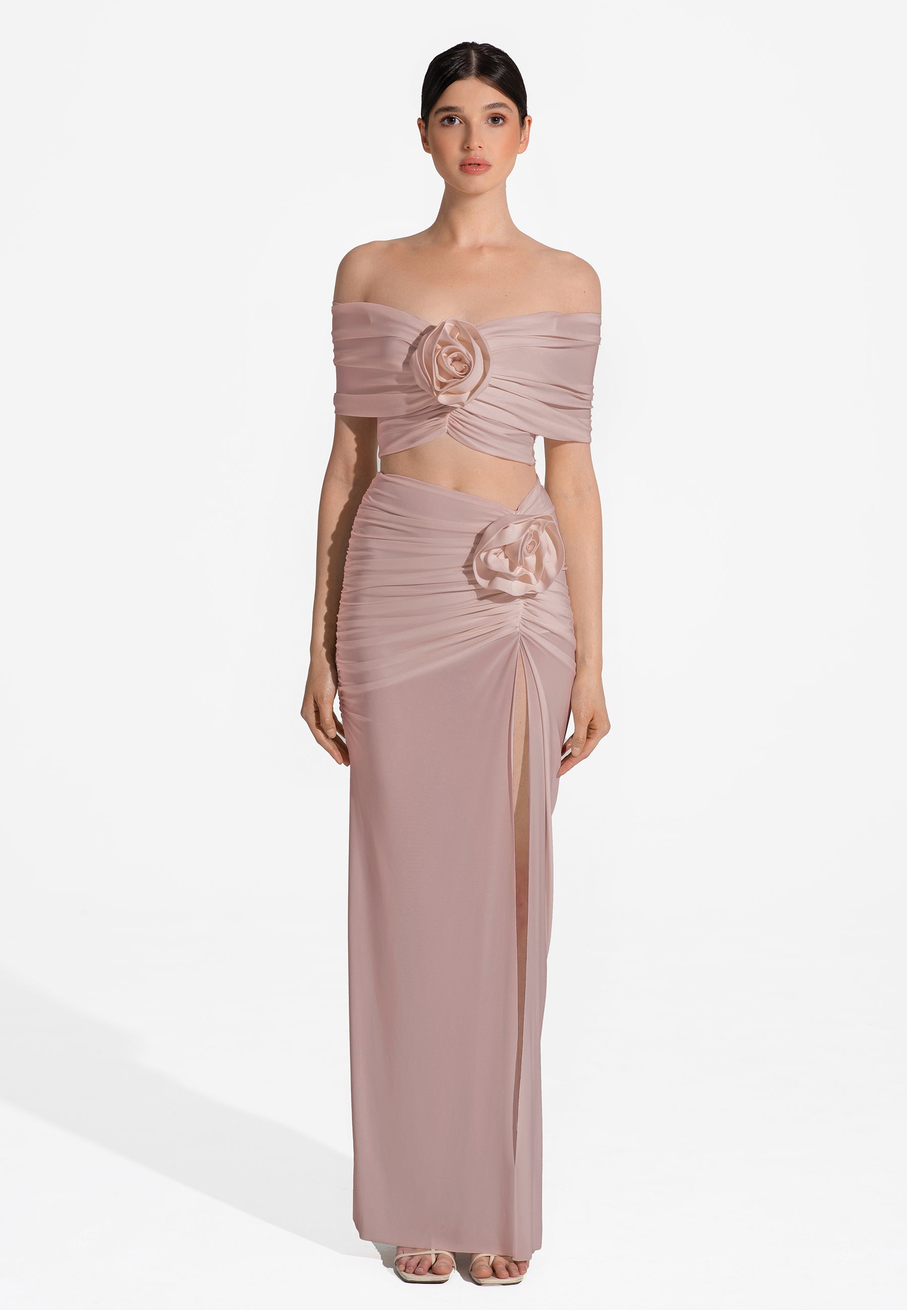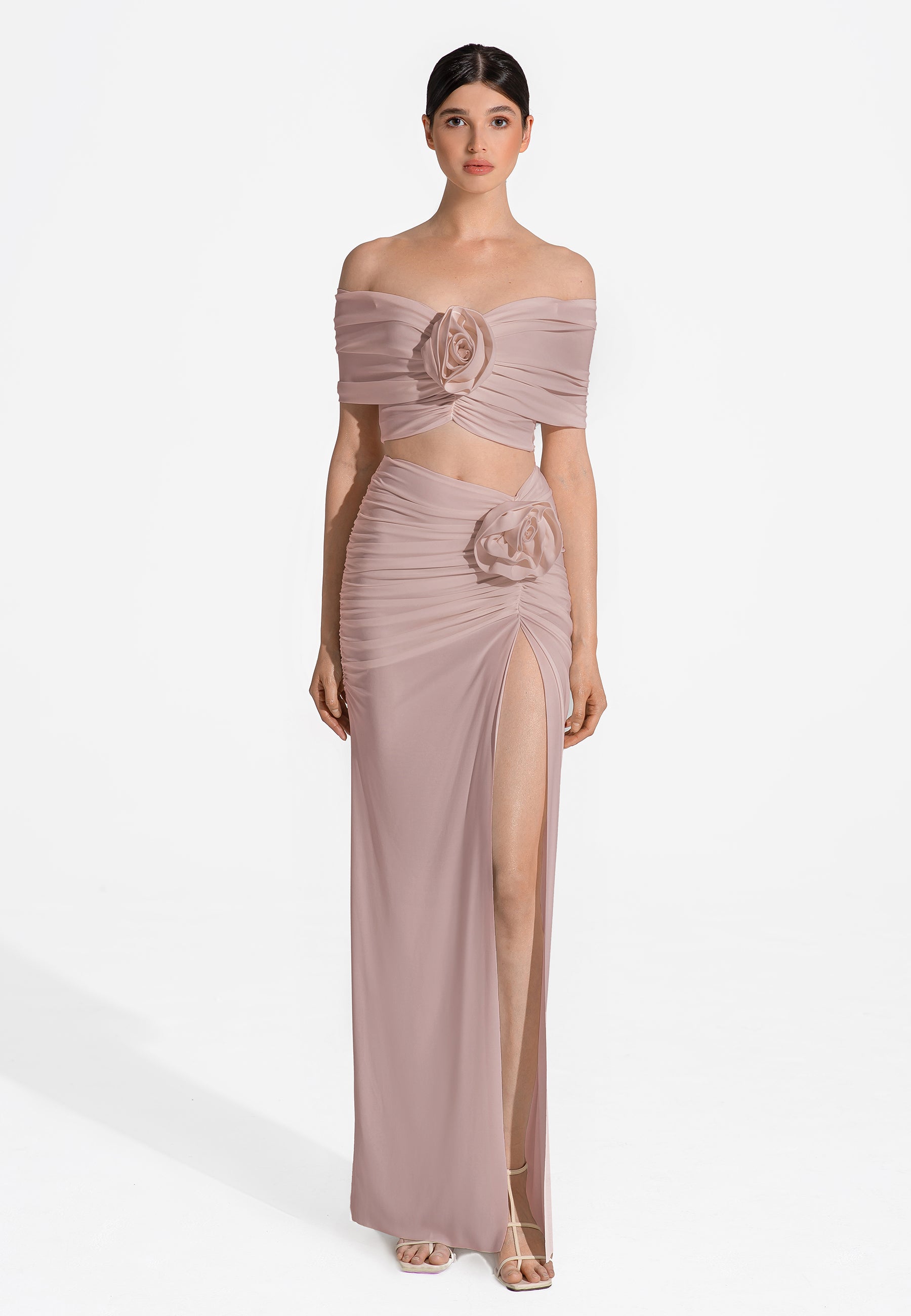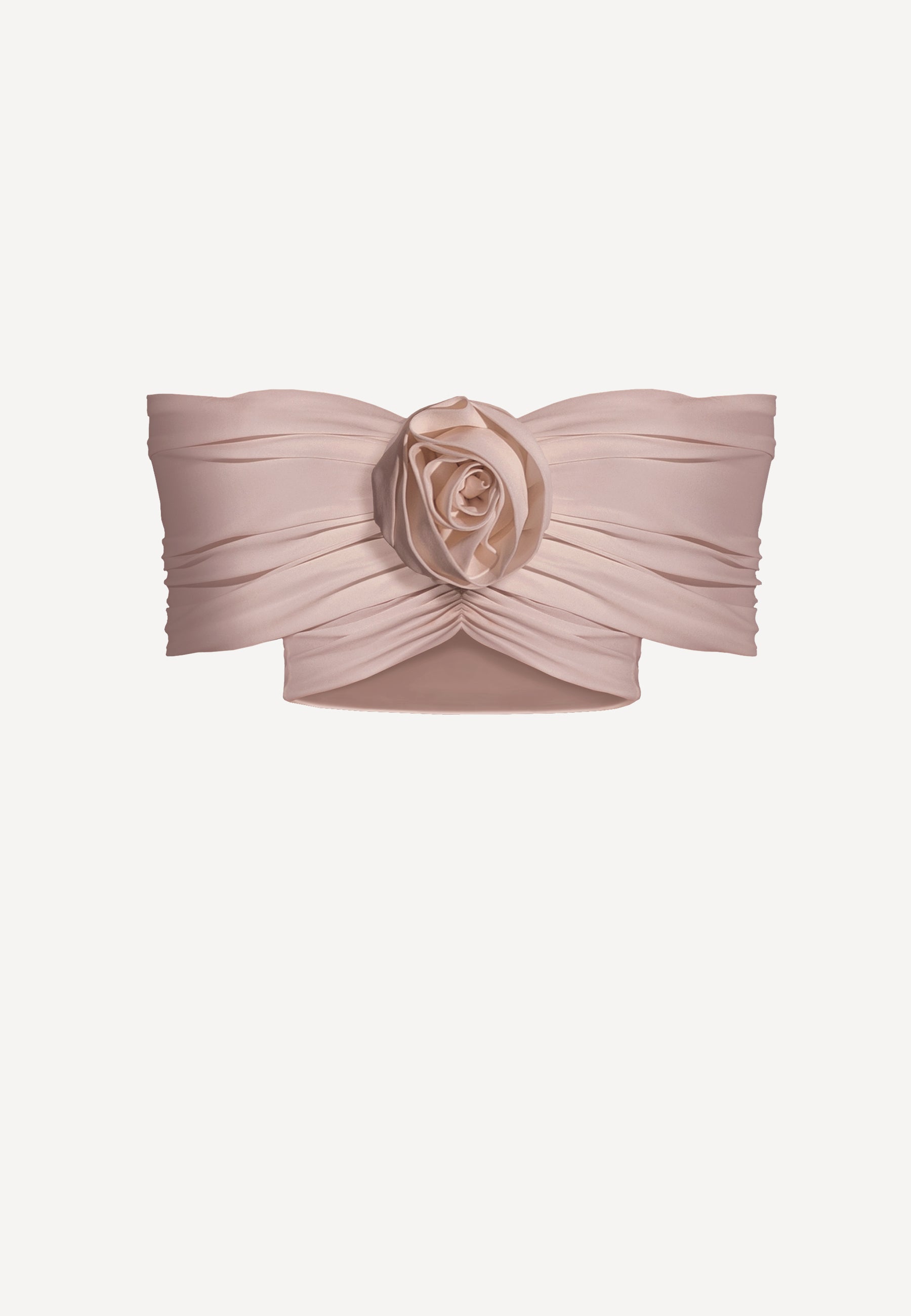 The Rosa Nude top is crafted from stretchy fabric, featuring gathers at the bust and waist. Its symmetrical cut flatters the figure, while an embellished rose adds an elegant touch.