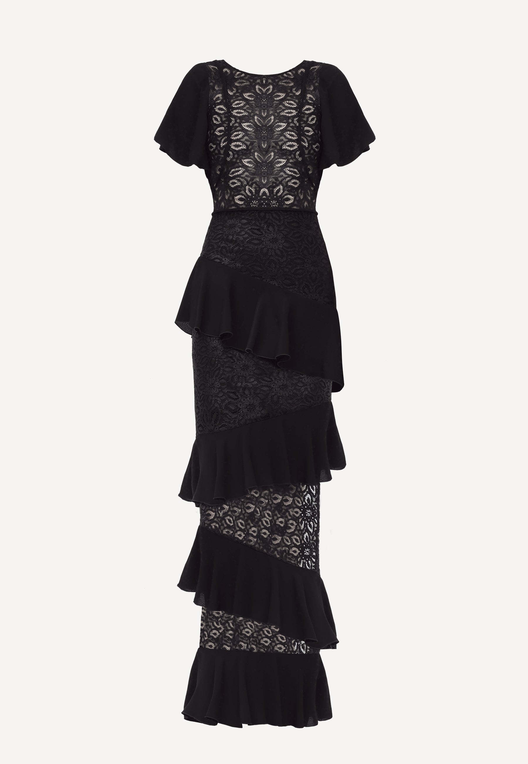 This elegant dress is crafted from mid-weight lace and georgette, combining texture and flow for a stunning look. The skirt features four cascading tiers of ruffles, adding movement and charm. The top is adorned with trimmed bust cuts, while the asymmetrical design beautifully accentuates the figure. A side slit adds an alluring touch, completing this sophisticated piece.