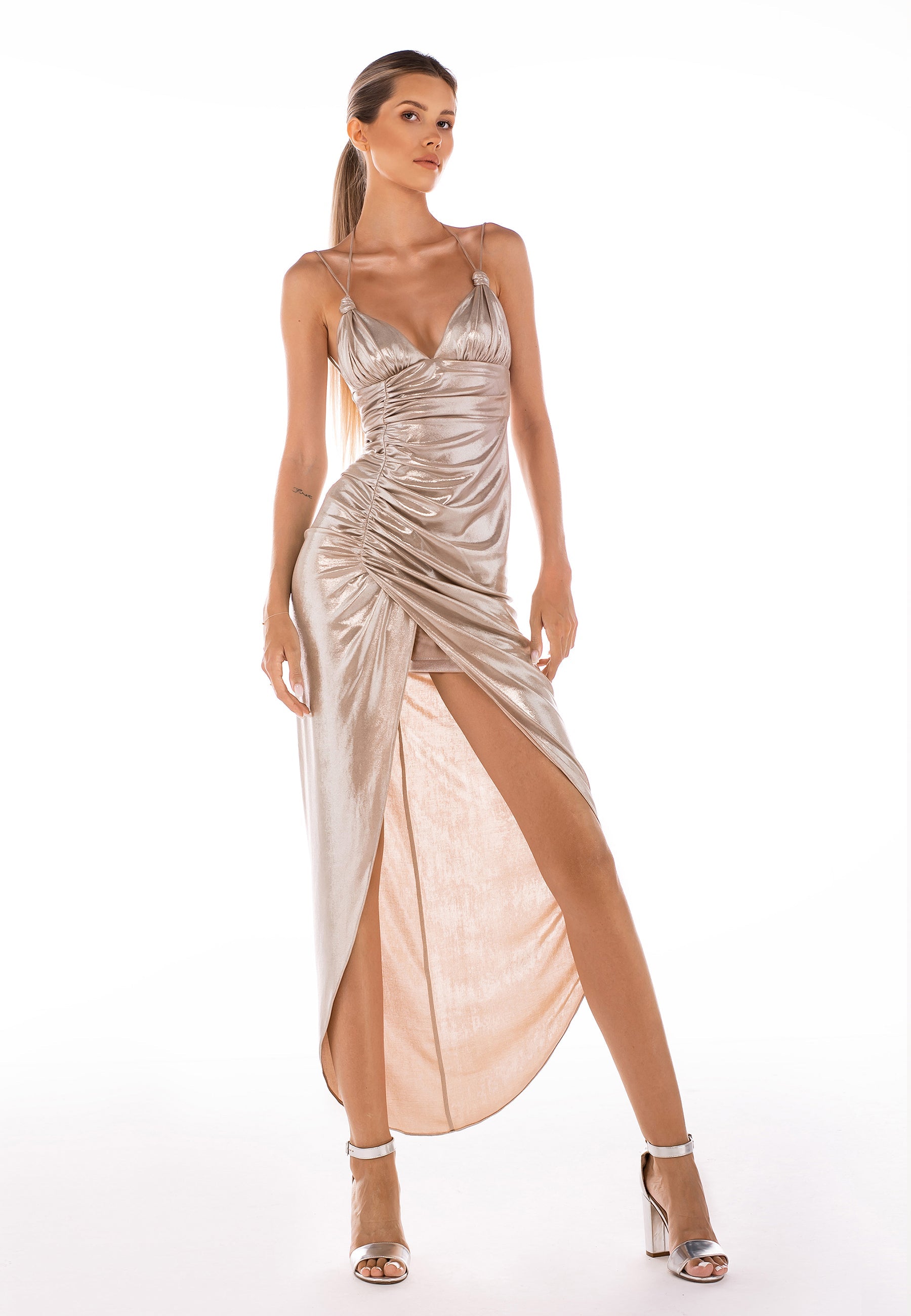 The dress is crafted from a stretchy fabric coated with a silver sheen, asymmetrically gathered, featuring double straps that can be styled in various ways. The large neckline beautifully accentuates the collarbones.