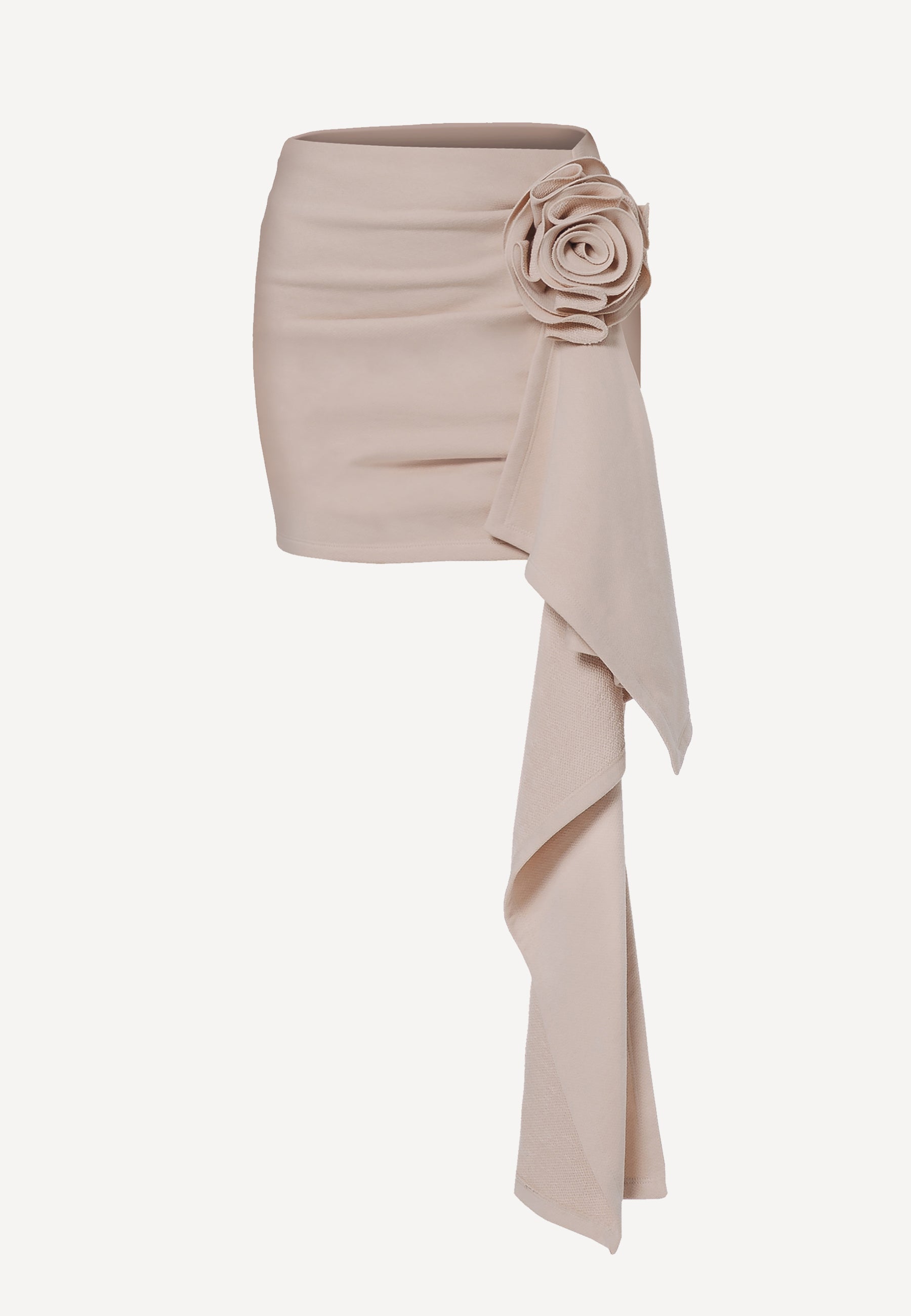 The Wilson skirt is crafted from plush knit fabric featuring a draped side. Adorned with a hand-rolled appliqué in the form of a flower with a trailing train.